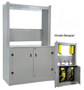 | Ölbar bestehend aus einem Unterschrank mit einer Sicherheits-Ölauffangwanne mit einem Fassungsvolumen von ca. 220 L, für die Unterrbringung von maximal 2 x 200 L Fässer und einer Montagebrücke für die Befestigung von Geräten und Aufroller. Schrank ist abschließbar. |