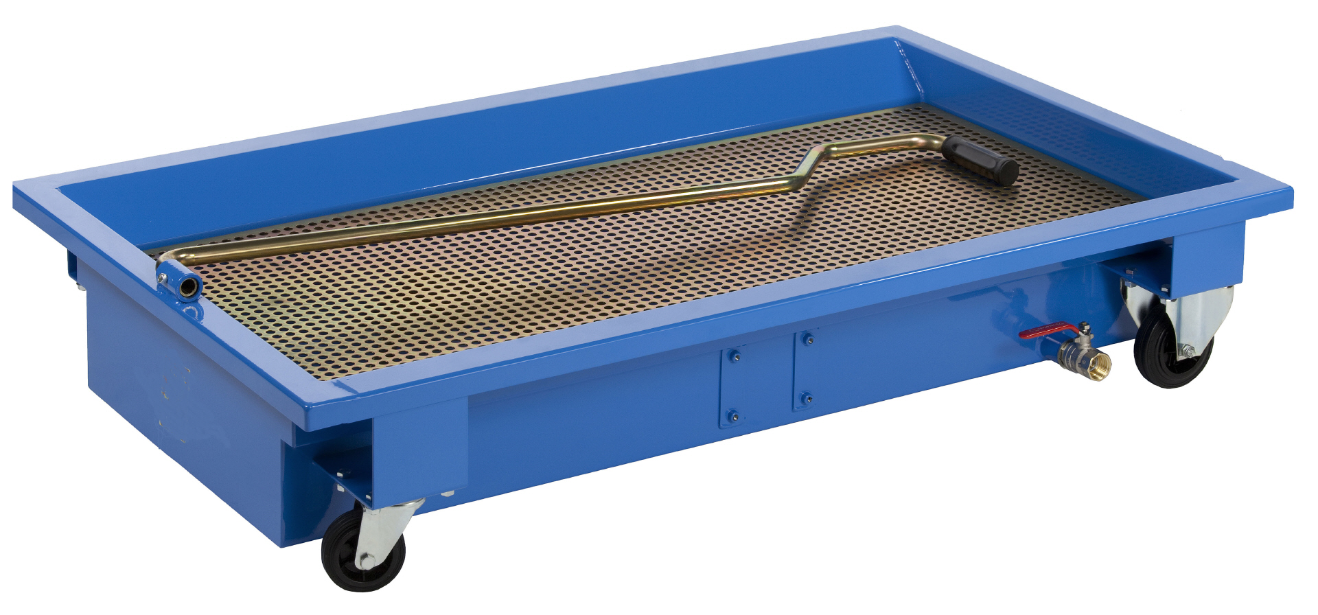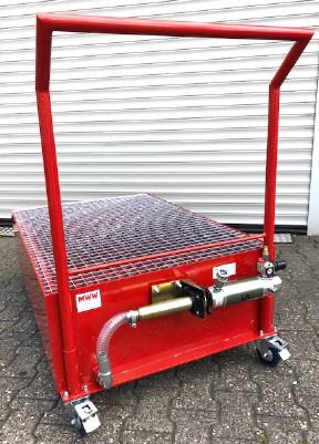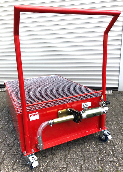 Fahrbare, ebenerdige Ölablass-Auffangwanne mit ca. 220 Ltr. Auffangvolumen, ausgestattet mit Anti-Schwellblechen, pneumatischer Entsorgungspumpe, 2 x feststehende und 2 x lenkbare Räder mit Feststellbremse, Schiebevorrichtung kann abgenommen werden. Pneumatische Entsorgungspumpe mit Ansaug-Schmutzsieb und Druckregler inkl. Manometer und Hydraulikanschluß für flexiblen Schlauchanschluß beim Entleeren der Wanne. Förderleidtung je nach Viskosität und Abgabelänge des Schlauches ca. 10 Ltr./min. |