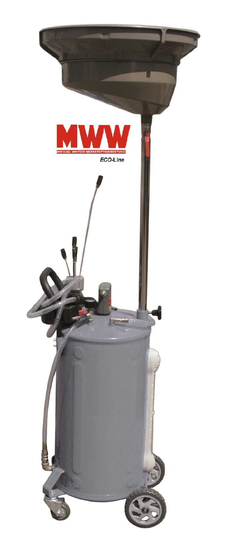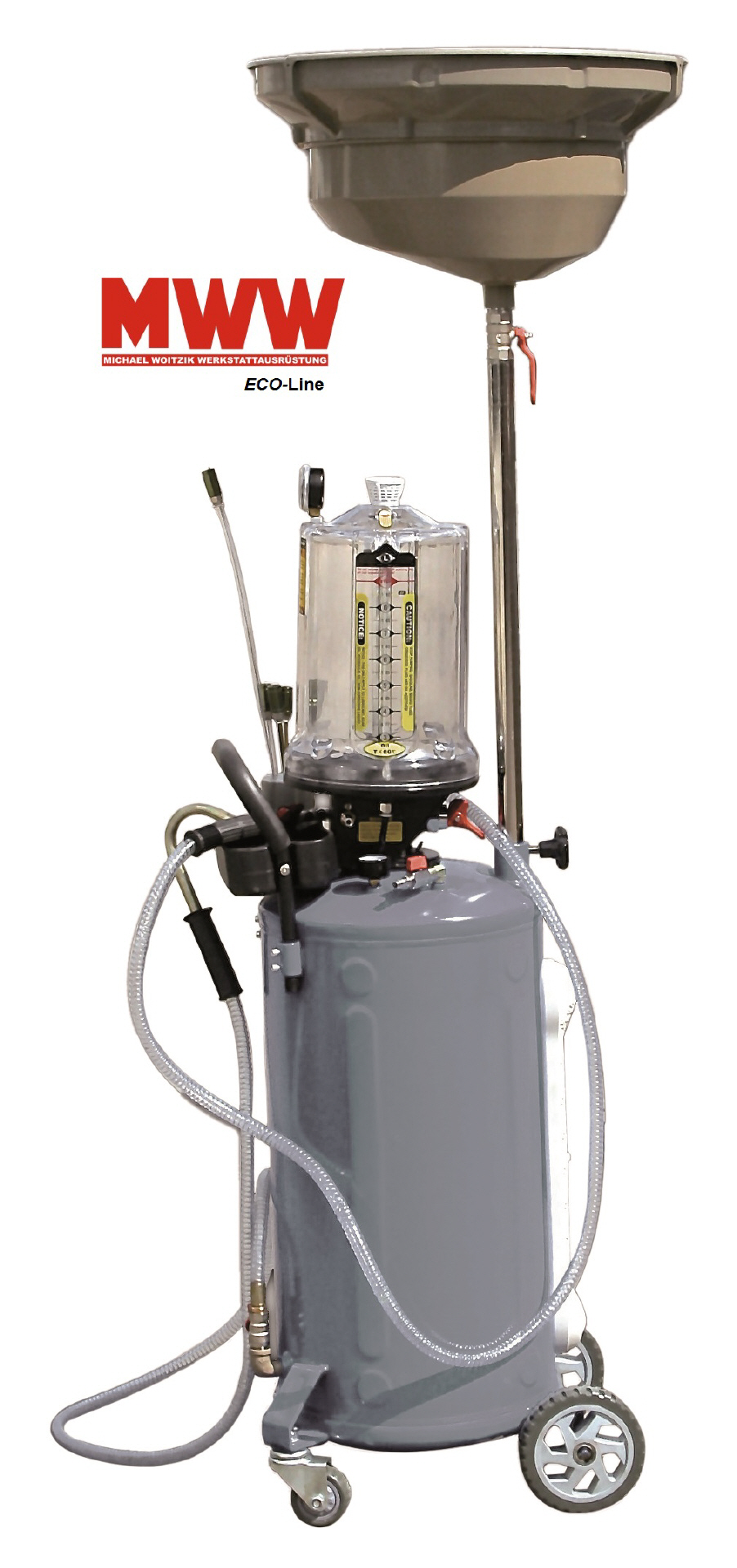 Fahrbare Altölauffang- und Absauggeräte mit und ohne Kontrollbehälter. Zum Zwischenlagern von Gebrauchtölen aus Motoren, Getrieben und Achsen von Fahrzeugen aller Art. Höhenverstellbarer Auffangtrichter mit großem Durchmesser und die Absaugung erfolgt durch Unterdruckerzeugung mittels einem leisen Injektormotor. Die Entleerung erfolgt durch Beaufschlagung von Druckluft. Stabile, kugelgelagerte und ölresistende Räder, Anfahrschutz um die Absaugeinheit und ein Ablagefach sind nur einige Highlights. Zum Kombigerät gehören unter anderem auch 6 Stk. Universal-Saugsonden mit angebautem Sondenköcher dazu.