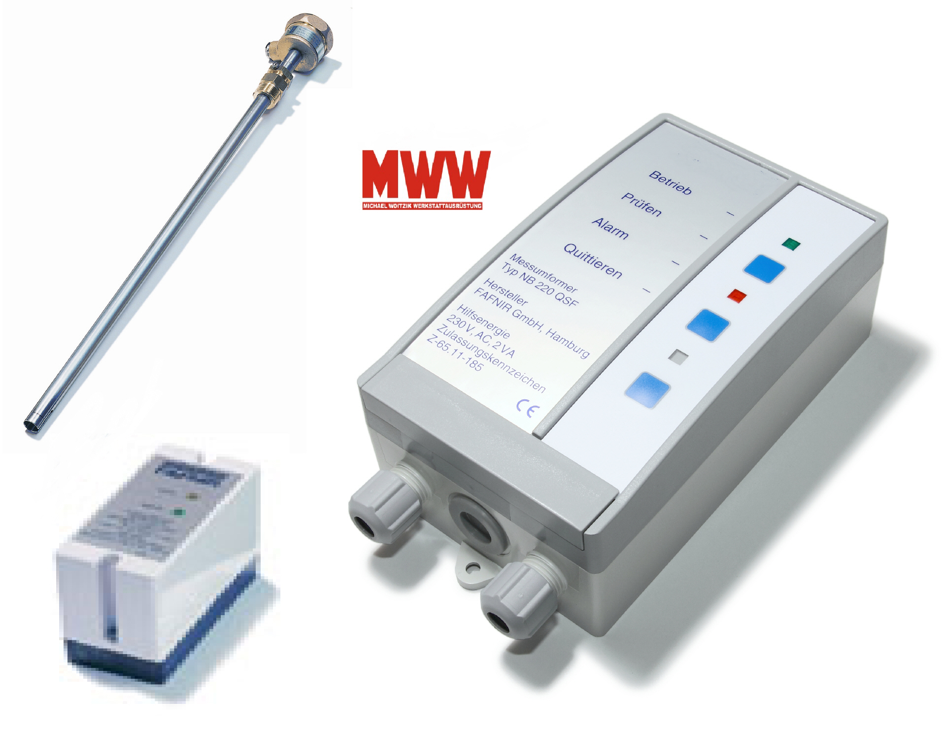 Lecköl-Warngerät bestehend aus optoelektronischer Sonde und einem Anzeige-Warngerät mit optischer und akustischer Signalgebung bei einer Leckage. Gerät kann bis zu 5 Tanks kontrollieren. Zulassungs-Nr. Z-65.40-339 |