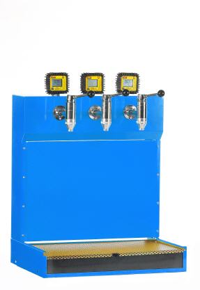 Ölbar zum Abstellen des Messbechers oder Ölkanne auf Abstellgitter und Öltropfwanne beim Zapfen, gleichzeitig mit Unterschrank zum Aufbewahren des Ölfasses bis max. 200 Liter. Optional mit digitalem Zähler oder Mengenvorwahl zum genauen Abfüllen. Abb. mit pneumatischer Pumpe |